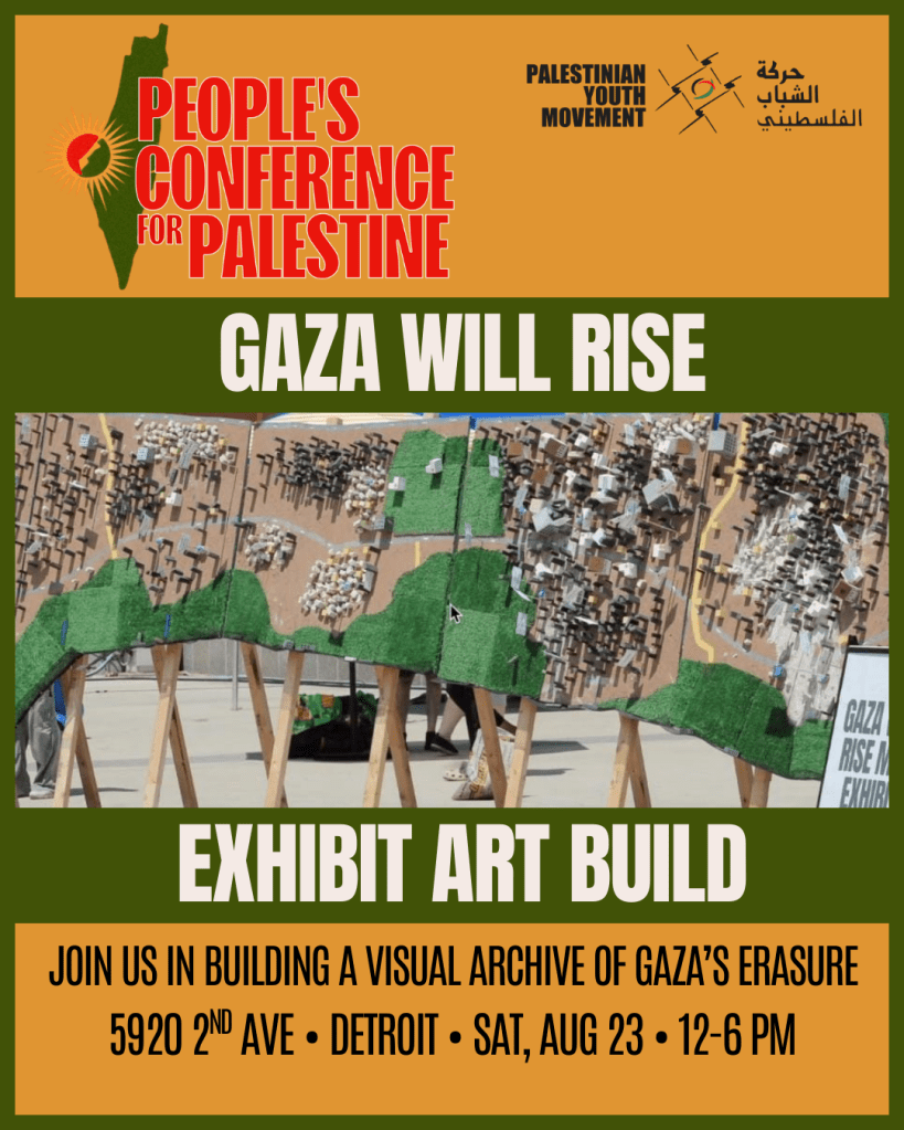 MICHIGAN: Join us this Saturday, anytime between 12-6pm, for the final session of the Gaza Will Rise art build. This exhibit will be displayed at the People’s Conference for Palestine as a visual archive of Gazas destruction, and will prompt people from around the world to continue struggling for Palestinian liberation. All ages welcome!