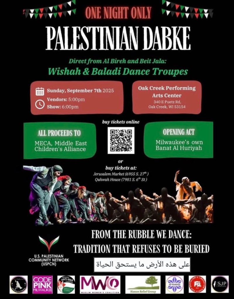 Join M4P and the U.S. Palestine Community Network (USPCN) – Milwaukee for a night of Palestinian Dabke. This event will be a celebration of culture, resistance, and resilience through dance. Enjoy performances by Banat Al Huriyah, Wishah, and Baladi. All proceeds from the event will be donated to MECA, the Middle East Children’s Alliance. Tickets can be purchased here. Join us as we assert our identity, celebrate our heritage, and stand in solidarity with Palestine. Culture is resistance. Dance is defiance. This performance brings to life the Dabke, a powerful Palestinian folk dance rooted in tradition and resilience. With its driving rhythms and collective energy, Dabke embodies unity, resistance, and cultural pride, telling the story of a people who carry their heritage forward through movement and song. It is more than a dance, it is a living symbol of identity and strength.