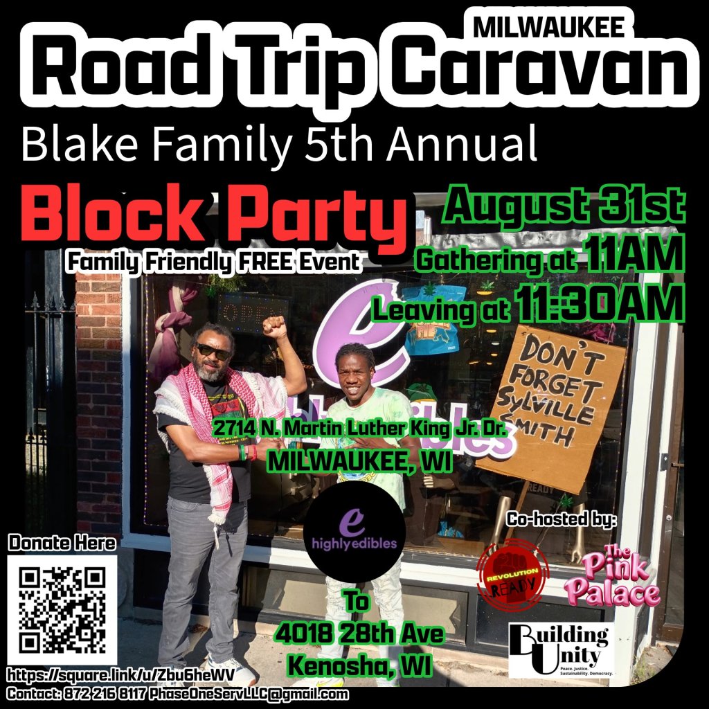 Categories Uncategorized Milwaukee/Chicago Road Trip Caravan to Blake Family 5th Annual Block Party August 31, 2025 Post author By WiBOPM Post date August 28, 2025 Black Underground Recycling Event: https://www.facebook.com/share/1Ax5szUiVS/ Share this: Click to share on X (Opens in new window) X Click to share on Facebook (Opens in new window) Facebook Like Loading... Related ← UAW 95 Members Eight Weeks on Strike! Still Need Support (Information) → August 29, 2025: Don’t Let Them Take Mumia’s Eyesight; Free Him Now! – Virtual Press Conference