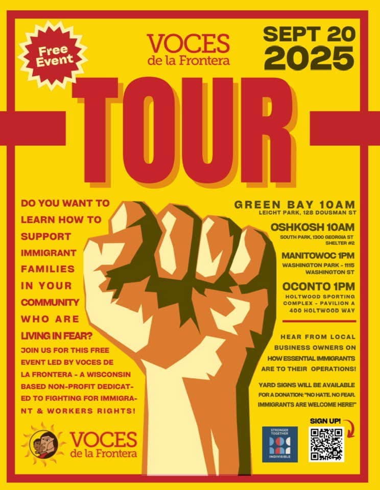 Categories Uncategorized Wisconsin, September 20, 2025: Voces de la Frontera Tour – Support Immigrant and Worker Rights! (City Listings) Post author By WiBOPM Post date September 2, 2025 Voces de la Frontera Share this: Click to share on X (Opens in new window) X Click to share on Facebook (Opens in new window) Facebook Like Loading... Related ← Emergency Protest Plan! – Chicago Says No Trump! No ICE! No Troops! → David Rovics & Kamala Emanuel: Madison September 4 and Milwaukee September 6, 2025
