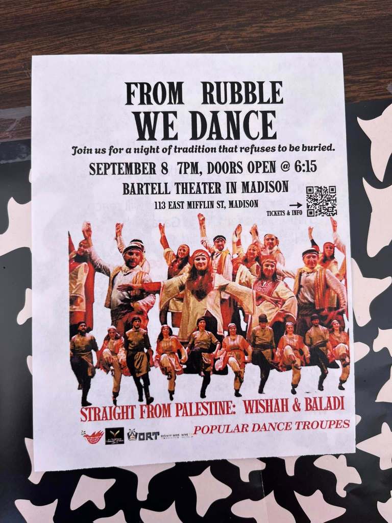 Mon Sept 8, 7 pm — Presentation of “From Rubble We Dance”: Palestinian Folkloric Dance Troupes, Wishah and Baladi. At Bartell Theater, 113 E Mifflin St. See above for more information.