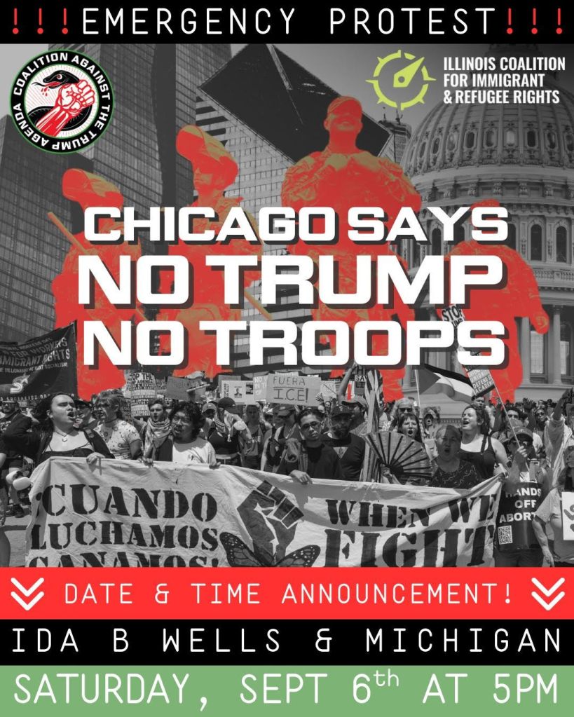 Categories Uncategorized Chicago, September 6, 2025: Emergency Protest! – No Trump! No Troops! No ICE! Post author By WiBOPM Post date September 5, 2025 Share this: Click to share on X (Opens in new window) X Click to share on Facebook (Opens in new window) Facebook Like Loading... Related ← Bubbles and lies: Trump’s tariff economy and the AI hype machine → Mumia’s Message to Detroit Conference for Palestine