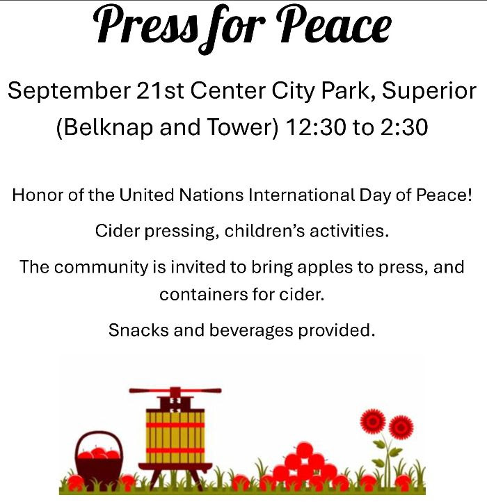 Categories Uncategorized Superior, WI September 21, 2025: International Day of Peace Post author By WiBOPM Post date September 13, 2025 Sponsored by Northland Grandmothers for Peace and Vets for Peace. Contact christineolson3@gmail.com Share this: Click to share on X (Opens in new window) X Click to share on Facebook (Opens in new window) Facebook Like Loading... Related ← Jefferson, WI, October 28, 2025: Youth LGBTQIA Safe Space Group → Madison, September 17, 2025: An Evening of Music for Palestine