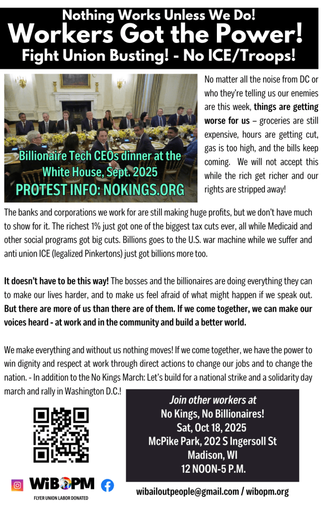 Categories Uncategorized Build Workers’ Delegations at No Kings Protests October 18, 2025! – Fight the Billionaires! Post author By WiBOPM Post date September 25, 2025 Find Event Here: https://www.nokings.org/#map Wisconsin Bail Out The People Movement Share this: Click to share on X (Opens in new window) X Click to share on Facebook (Opens in new window) Facebook Like Loading... Related ← October 18, 2025: No Kings! No Billionaires! – Southern Workers Fight Back! → Wisconsin Abortion Fund