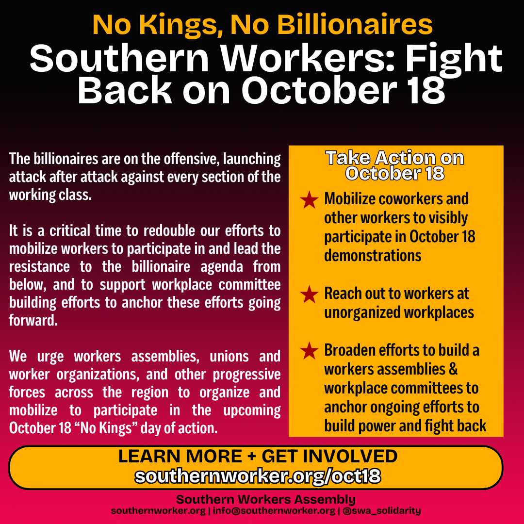 | The billionaires are on the offensive, launching attack after attack that’s impacting every section of the working class. Beyond their immediate objectives, they hope that the furious pace of attacks, their consolidation of power, and the uncertainty, division, and fear that is gripping every part of society will keep workers paralyzed and unable to independently intervene to fight back. It is a critical time to redouble our efforts to mobilize workers to participate in and lead the resistance to the billionaire agenda from below, and to support workplace committee building efforts to anchor these efforts going forward. On October 18, a “No Kings” national day of action has been called, and demonstrations are being planned in dozens of cities and towns across the United States. To date, these demonstrations have been important but limited in their ability to raise the issues of and broadly mobilize the many sections of the working class. That must change. To that end, the Southern Workers Assembly is urging workers assemblies, unions and worker organizations, and other progressive forces across the region to: Mobilize coworkers, fellow union members, and other workers to visibly participate in organized workers contingents at upcoming October 18 No Kings, No Billionaires demonstrations Utilize this flier to organize leafletting at shift changes at unorganized, strategic workplaces in your area. Get contact information and follow up to encourage workers there to participate in your workers assembly, begin organizing at work, and come out to the October 18 demonstration. More guidance on conducting this work here. Broaden existing efforts or develop new work to build a workers assembly in your area to connect workplace committees and organizations together and to support ongoing workplace outreach and mobilization If you have questions or need additional support to take this work up locally, please reach out to info@southernworker.org |