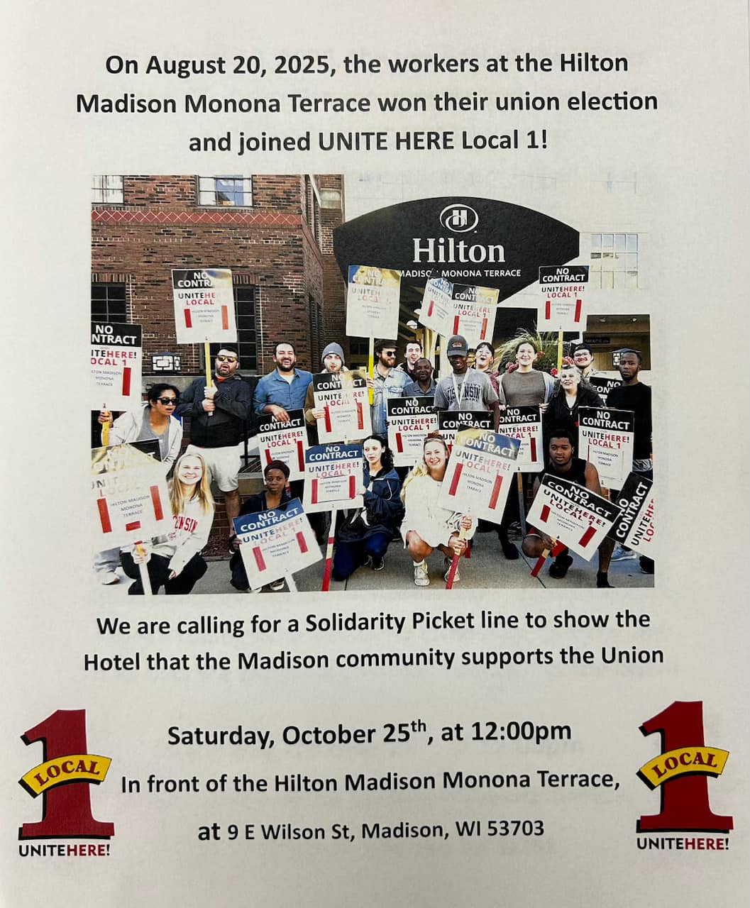 Categories Uncategorized Madison, October 25, 2025: Union Hotel Workers Rally at the Hilton Monona Terrace! Post author By WiBOPM Post date October 1, 2025 UNITE HERE Local 1 Share this: Click to share on X (Opens in new window) X Click to share on Facebook (Opens in new window) Facebook Like Loading... Related ← From Ukraine to Gaza, profit is the policy: Trump’s wars enrich defense conglomerates → Assata Shakur & Palestine Forever!