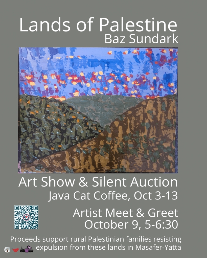 Don’t miss your chance to bid on one of these fabulous paintings inspired by photographs from the southern West Bank in the Baz Sundark Art Show & Silent Auctionfor Masafer Yatta Oct. 3-13. (Artwork on display at Java Cat,or you can go online here to see it, get more information, bid and/or make a donation.)