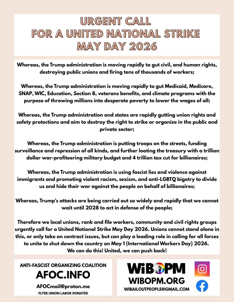 Categories Uncategorized Call to Action! We Must Unite to Defend Ourselves Against Trump’s Fascist Plans! – United National Strike May Day 2026! Post author By WiBOPM Post date October 3, 2025 https://afoc.info/ Wisconsin Bail Out The People Movement Workers Voice Socialist Movement Share this: Click to share on X (Opens in new window) X Click to share on Facebook (Opens in new window) Facebook Like Loading... Related ← ICE reactivated its $2 million contract with Israeli spyware firm Paragon, following its acquisition by U.S. capital → Milwaukee, October 4, 2025: Emergency Rally – MKE Solidarity with the Global Sumud Flotilla