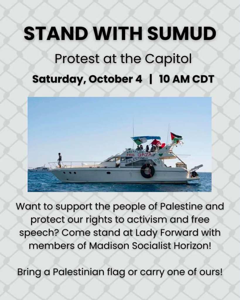 Categories Uncategorized Madison, October 4, 2025: Stand with Sumud Flotilla! – Free Palestine! Post author By WiBOPM Post date October 3, 2025 Share this: Click to share on X (Opens in new window) X Click to share on Facebook (Opens in new window) Facebook Like Loading... Related ← UW Madison, October 5, 2025: Hands Off Ethnic Studies! – Support Students & Workers! → U.S.-Israel’s Gaza Blockade Was Broken — Destroyer Ships Sent to Stop Flour, Baby Milk and Medicine