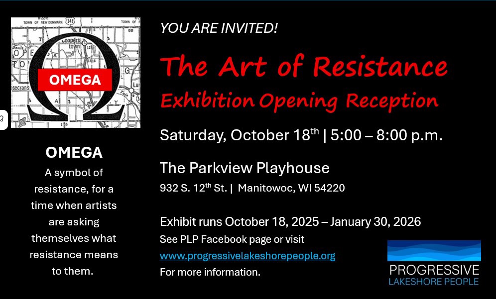 Come and see the art and meet the artists at the Parkview Playhouse – 932 S. 12th St., Manitowoc Wisconsin – Hosted by the Progressive Lakeshore People