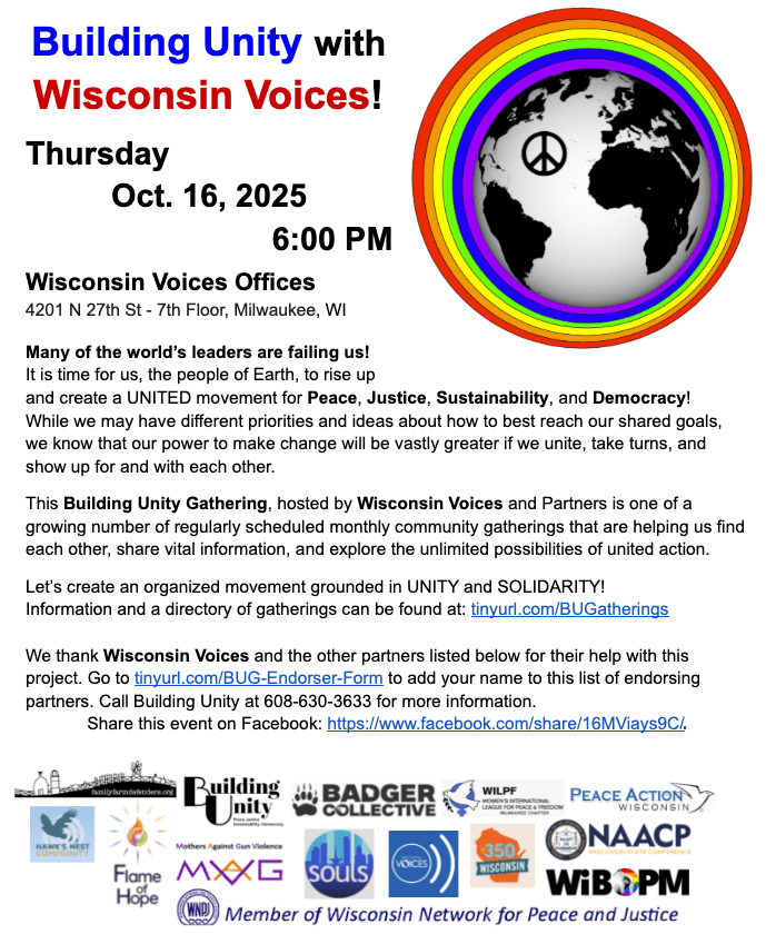- Thurs. Oct. 16, 2025 – Building Unity Gathering With Wisconsin Voices