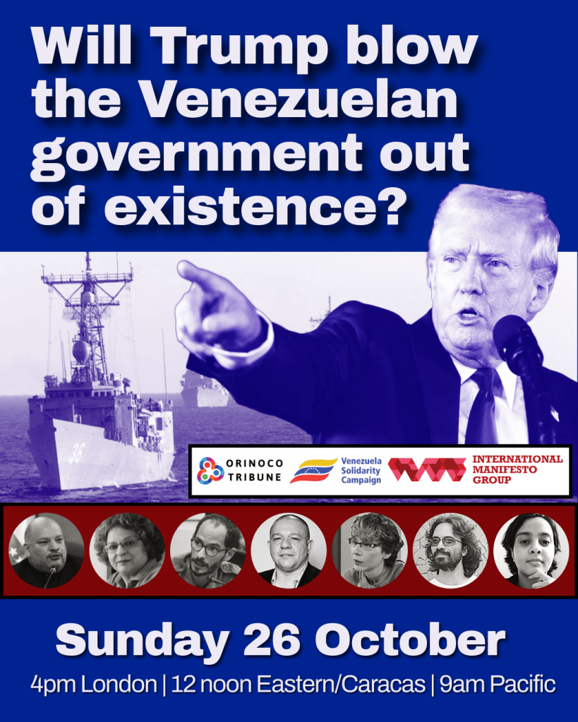 | Click here to Register Date and time Sunday 26th October 20254PM London | 12 noon Eastern/Caracas | 9am Pacific Please note: Due to daylight savings, this webinar is the same time as our previous webinars in Europe where clocks have gone back, but one hour later than usual in the Americas. About this Webinar What began as a customary US act of aggression—increasing the bounty on President Maduro’s head to $50 million—quickly revealed its true purpose: a military aggression aimed at violently overthrowing the Bolivarian government of Venezuela.This was compounded by the Venezuelan far-right’s smuggling of alarming quantities of explosives, detonators, ammunition, grenades, machine guns, and assorted war materiel into at least five key Venezuelan cities. The clear intention was to unleash a wave of armed violence to cause maximum disruption. The threatening deployment of the US war fleet—comprising around eight warships, F-35 fighter jets, and even a nuclear submarine—was ostensibly to halt drug smuggling, allegedly from Venezuela. In reality, it was to intervene and assist the Venezuelan far-right’s wave of violence.Since its deployment, the US fleet has destroyed four small boats, blatantly perpetrating crimes against humanity that have thus far killed 21 people. The latest and most grave escalation of the US military threat was Trump’s executive order, which declared the US to be in a formal state of “armed conflict” with Latin American drug cartels. This provides a pretext for US military forces to launch attacks on Venezuelan territory. All of this is based on a monumental fabrication: the false charge that the Venezuelan government has shipped hundreds of tons of cocaine into the US, in operations led by the non-existent ‘Cartel de los Soles’.Following the absurd decision of the Nobel committee to award the Peace Prize to coupmonger María Corina Machado, who has openly called for a military assault on Venezuela, this webinar will examine the growing threat of US militarization in Latin America and how Venezuelans are responding to the threat of invasion. Speakers Carlos Ron – former Deputy Minister of Foreign Affairs for North America (2018–2025) and president of the Simón Bolívar Institute for Peace and Solidarity Among Peoples (2020–2025). Maria Paez Victor – Venezuelan sociologist. Diego Sequera – Mision Verdad. Cira Pascual Marquina – Popular educator, Pluriversidad, El Panal Commune, Caracas’. Ricardo Vaz – Venezuelanalysis. Jesus Rodriguez-Espinoza – Editor, Orinoco Tribune.Moderator: Saheli Chowdhury – co-Editor, Orinoco Tribune Organizers: Organised by Orinoco Tribune & Venezuela Solidarity Campaign. Hosted by International Manifesto Group. Please consider making a donation as you register on Eventbrite so that we may defray our small but real costs of administration. |