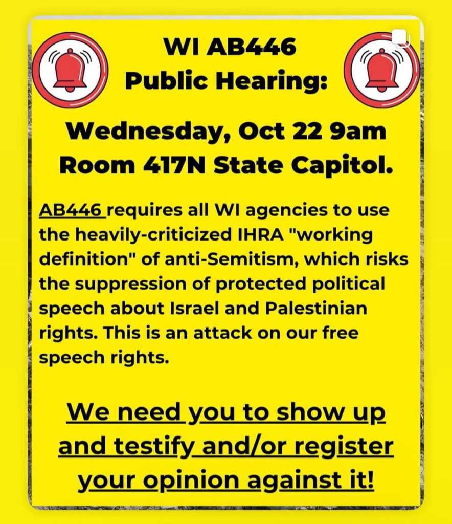 Categories Uncategorized WI AB446 Public Hearing at State Capitol in Madison, WI October 22, 2025 – Stop the Chilling of Free Speech! Post author By WiBOPM Post date October 21, 2025 Share this: Click to share on X (Opens in new window) X Click to share on Facebook (Opens in new window) Facebook Like Loading... Related ← Workers take steps to unionize at four D.C. music venues → Free Mumia Abu-Jamal Now!
