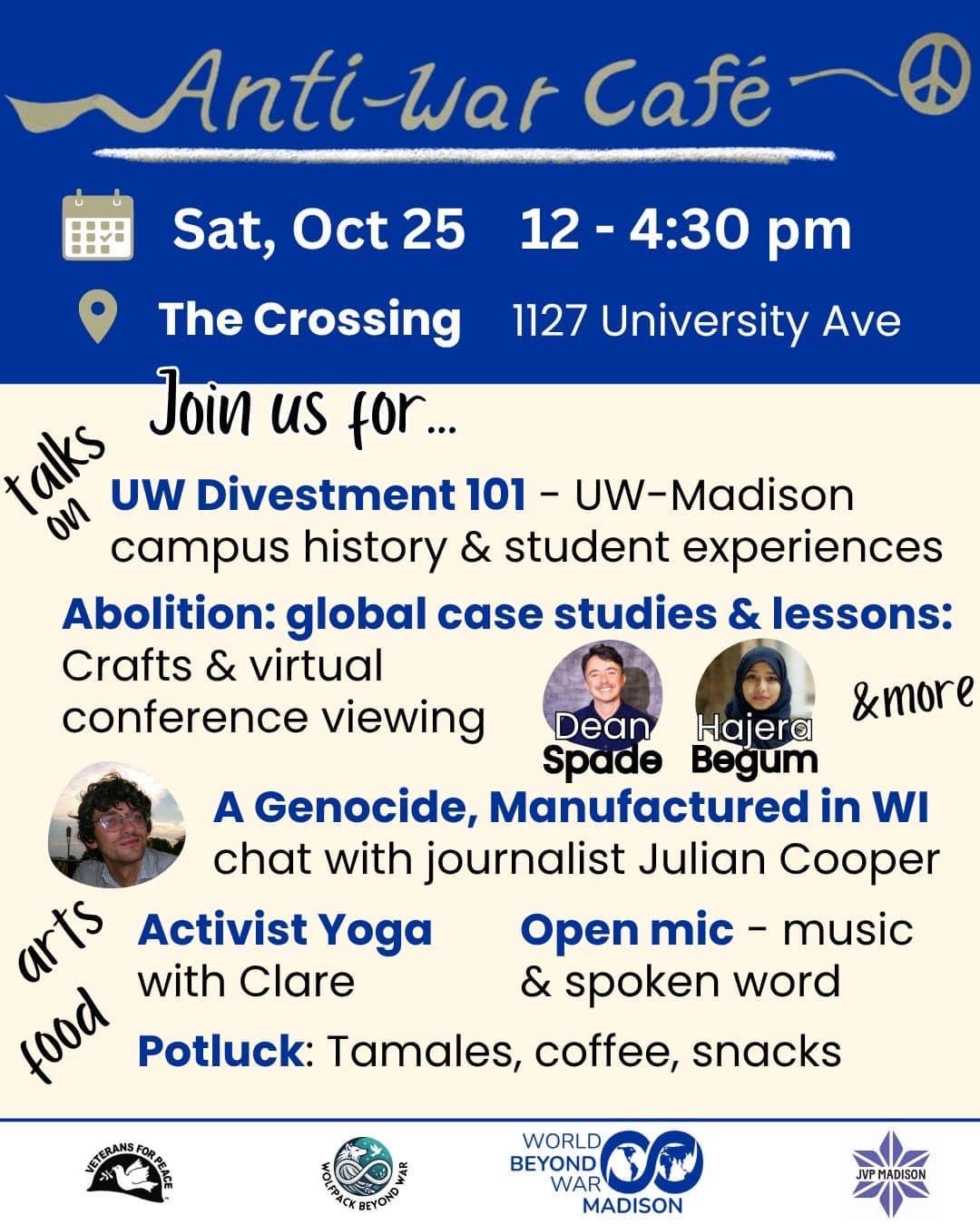 Categories Uncategorized Madison, October 25, 2025: Anti-War Cafe Post author By WiBOPM Post date October 22, 2025 Share this: Click to share on X (Opens in new window) X Click to share on Facebook (Opens in new window) Facebook Like Loading... Related ← Milwaukee: Discovery World Workers Union – Community Solidarity Day 10/25/25 11AM-12PM → Voces de la Frontera: Know Your Rights & Emergency Hotline
