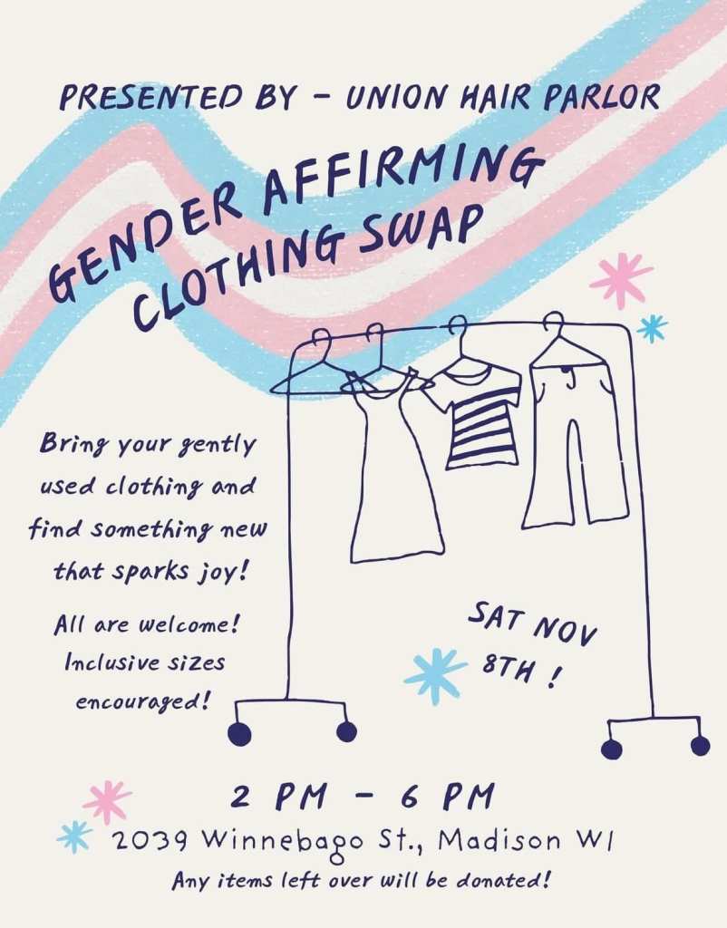Categories Uncategorized Madison, November 8, 2025: Gender Affirming Clothing Swap Post author By WiBOPM Post date October 26, 2025 Share this: Click to share on X (Opens in new window) X Click to share on Facebook (Opens in new window) Facebook Like Loading... Related ← Wisconsin: Stand for Peace! Free Palestine! October 27-November 2, 2025 (City Listings) → SNAP benefits may not go out in November. Here’s where you can go for food assistance