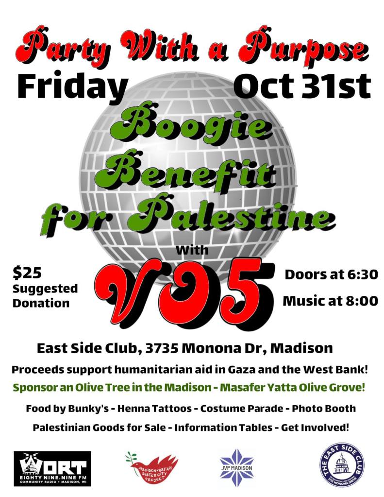 Fri Oct 31, 6:30 – 10 pm Boogie Benefit for Palestine with disco superstars VO5. At East Side Club, 3735 Monona Dr. $25. Questions? Contact: Madison-Rafah Sister City Project rafahsistercity@yahoo.com
