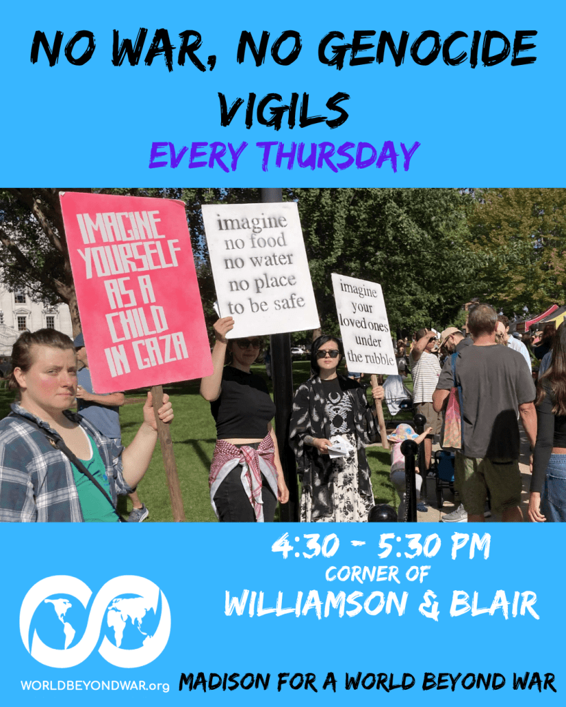Our vigil messages are abolish war, Stop Arming Israel, and Stop Starving Gaza. Bring a friend, a musical instrument, pot or pan, a sign if you’d like.