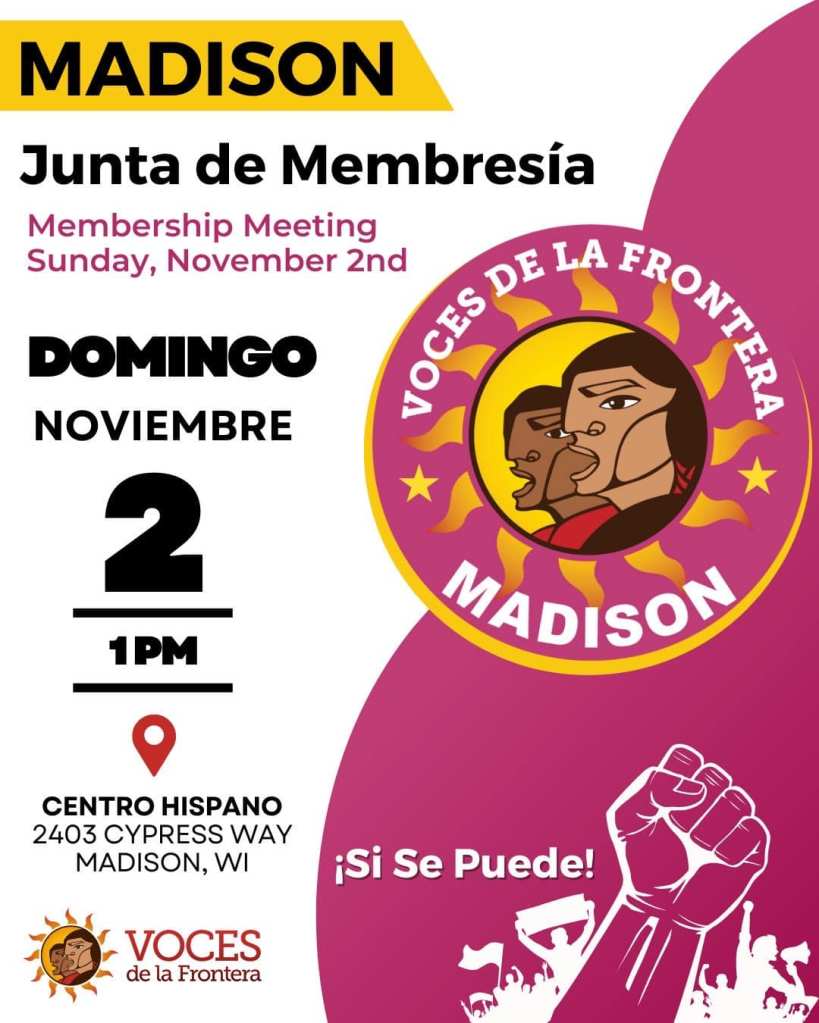 Categories Uncategorized Madison, November 2, 2025: Voces de la Frontera Membership Meeting Post author By WiBOPM Post date October 29, 2025 Voces de la Frontera Share this: Click to share on X (Opens in new window) X Click to share on Facebook (Opens in new window) Facebook Like Loading... Related ← Chicago Teachers Union: Statement on Federal Court Ruling Mandating Daily Reporting From ICE → Mexico Solidarity Bulletin October 29, 2025