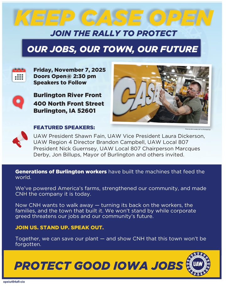 Categories Uncategorized Burlington, Iowa, November 7, 2025: Keep Case Open! Support UAW Workers! Post author By WiBOPM Post date October 30, 2025 UAW Local 180 UAW Region 4 Share this: Click to share on X (Opens in new window) X Click to share on Facebook (Opens in new window) Facebook Like Loading... Related ← Madison, November 1, 2025: Rally to Demand Food Benefits! (Bring Donations) → Milwaukee: ACTION NEEDED: Protect Legal Counsel for Renters