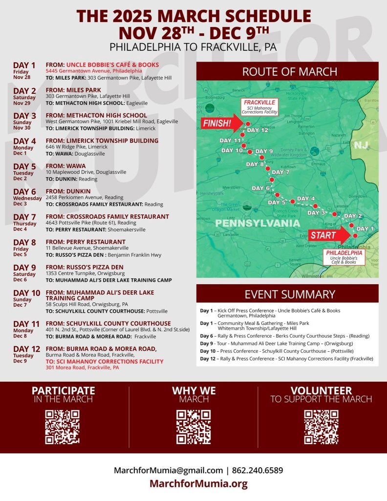 Categories Uncategorized Marching for Mumia: a 12-day journey for justice Post author By WiBOPM Post date November 3, 2025 Marching for Mumia: a 12-day journey for justice Share this: Click to share on X (Opens in new window) X Click to share on Facebook (Opens in new window) Facebook Like Loading... Related ← Russia Expresses Support for Venezuela and Latin America as Zone of Peace, Condemns US Aggression → DC teachers join lawsuit against ICE