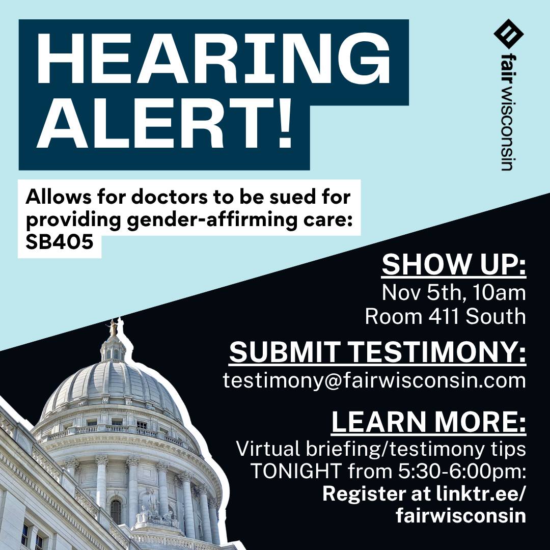 Anti-equality legislators have scheduled a hearing for yet another anti-trans bill. SB 405 would use the threat of lawsuits to discourage doctors from providing this important care, and it would inject politicians into the exam room where decisions should only be made by patients, doctors, and their families. Come testify in-person or send your written testimony to testimony@fairwisconsin.com