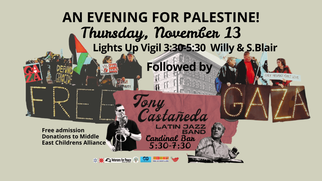 DRESS WARM and help us hold the Lights Up for Palestine signs at the last 2025 weekly vigil for peace at Willy and Blair Streets from 3:30 – 5:30 pm.