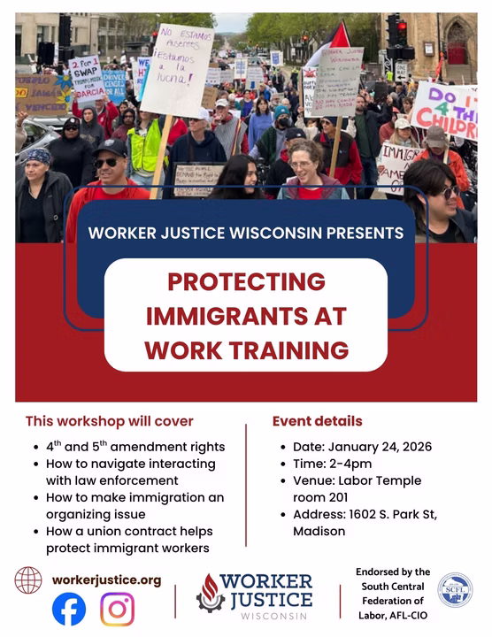 Categories Uncategorized Worker Justice Wisconsin January 24, 2026: ‘Protect Immigrants at Work’ Training Post author By WiBOPM Post date November 17, 2025 Home Share this: Click to share on X (Opens in new window) X Click to share on Facebook (Opens in new window) Facebook Like Loading... Related ← Madison Teachers Union Trivia Night January 17, 2026 → No U.S. War on Venezuela! – WE CAN STOP THIS WAR! Write Trump; Week of Actions; Other Events