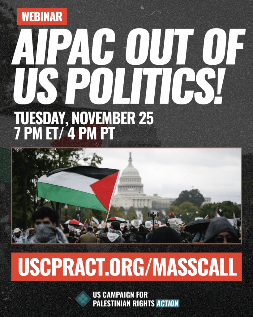 US Campaign for Palestinian Rights Action invites you to join this webinar to learn about the fight to demand that U.S. politicians reject AIPAC funding and represent their constituents, not Israeli interests.