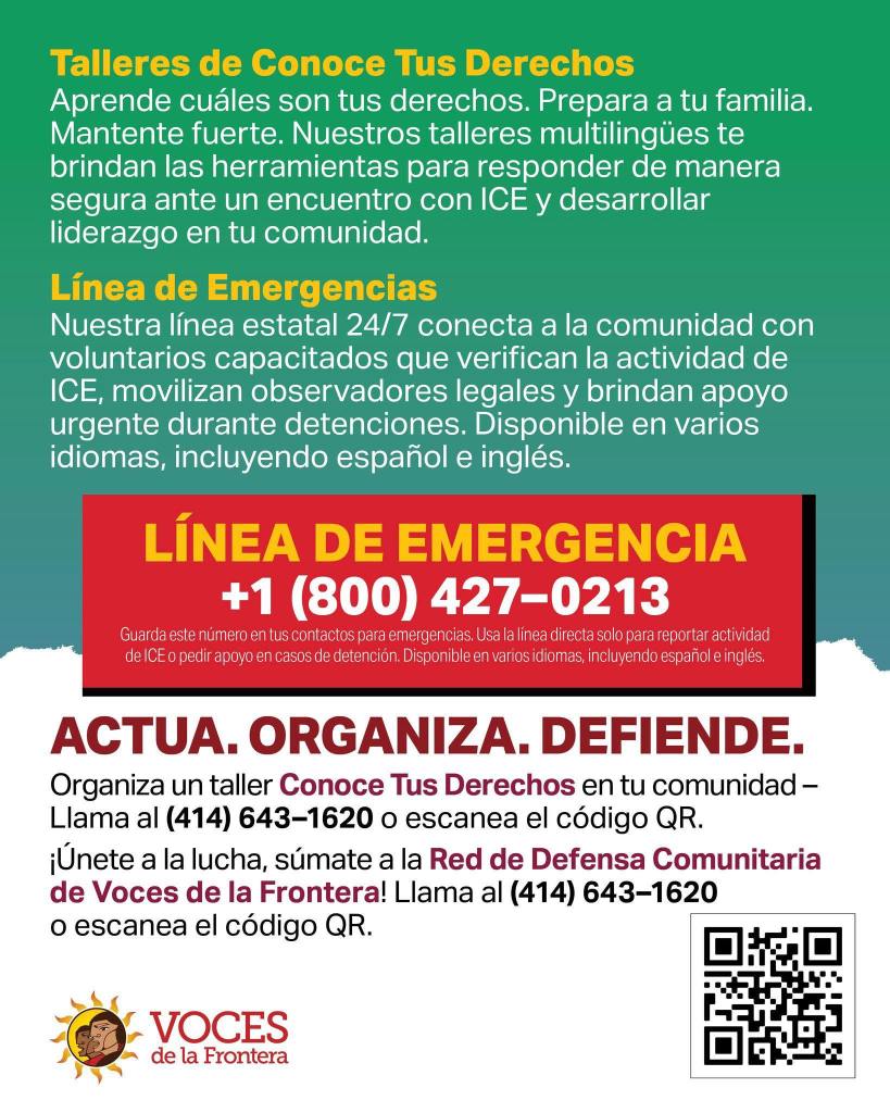 Categories Uncategorized Recursos para estar preparado y asistir en la defensa de comunidades inmigrantes en Wisconsin Post author By WiBOPM Post date November 19, 2025 Recursos para estar preparado y asistir en la defensa de comunidades inmigrantes en Wisconsin. #ElPuebloSalvaAlPueblo https://qrco.de/bg5z48 Share this: Click to share on X (Opens in new window) X Click to share on Facebook (Opens in new window) Facebook Like Loading... Related ← Starbucks Workers United: Big rallies, hundreds of actions, and heavy hitters holding the line → Starbucks Workers Lock Arms in Front of Distribution Trucks; Demand Just Contract NOW!