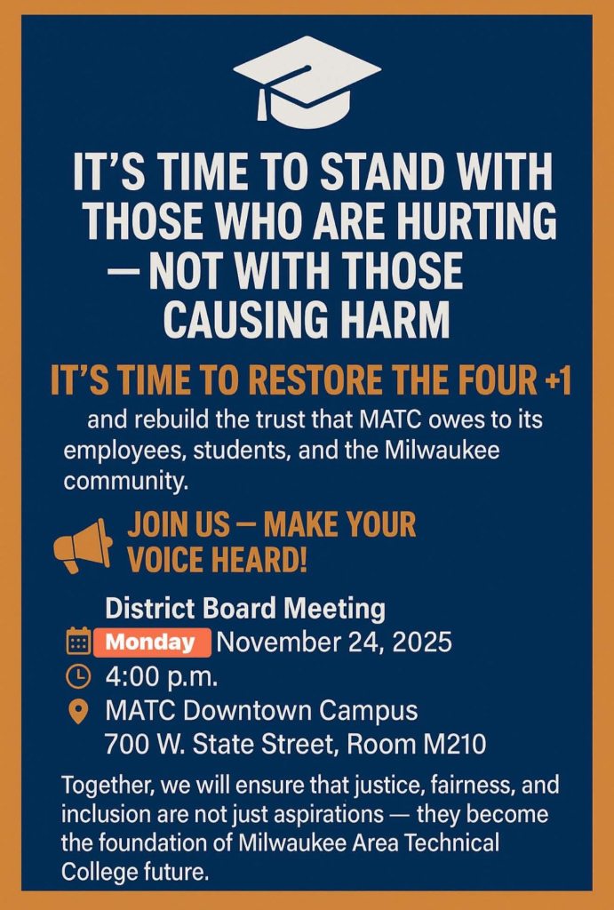 On November 19 2025, Attorney Mark Thomsen addressed the four discrimination complaints filed with the WI Equal Rights Division by the four former Multicultural Affairs Office Student Services Specialists who were unjustly terminated after MATC President Dr. Anthony Cruz eliminated the office.