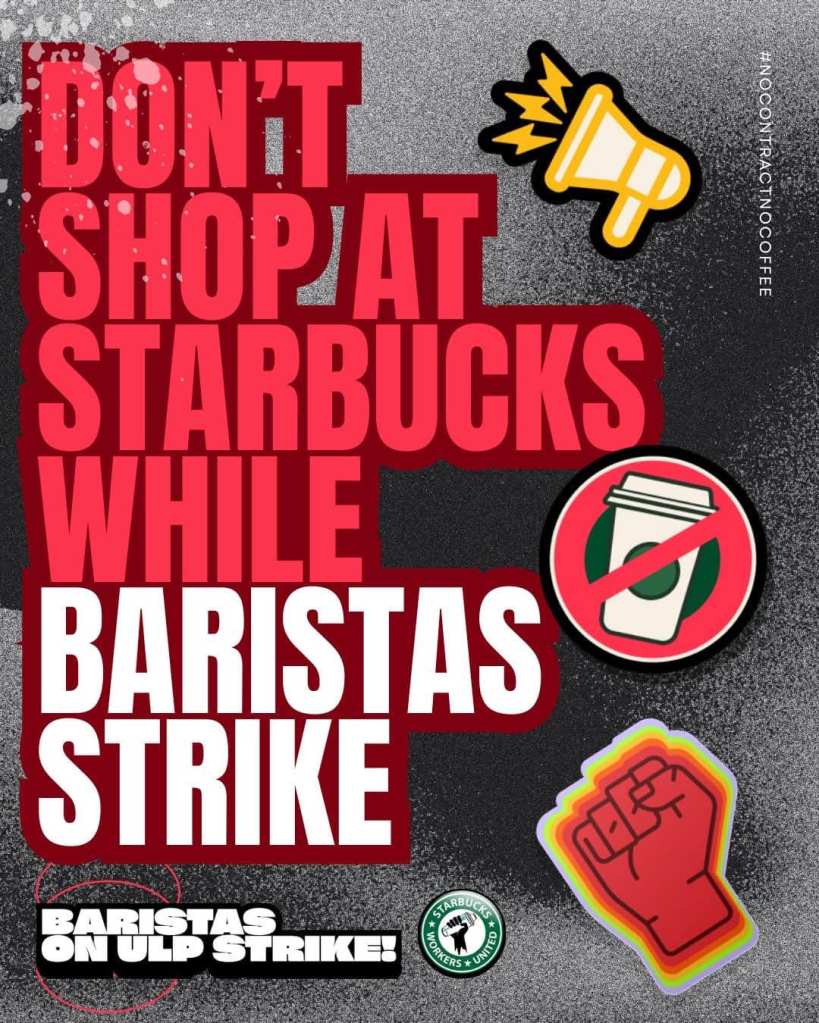 ICYMI: Union stores in more than 25 cities joined our open-ended ULP strike. That brings us to 95 stores on strike in over 65 cities across the country. And allies stepped up too! More than 150 flyering actions at non-union stores helped spread the truth about Starbucks’ union-busting and build support and solidarity with baristas.