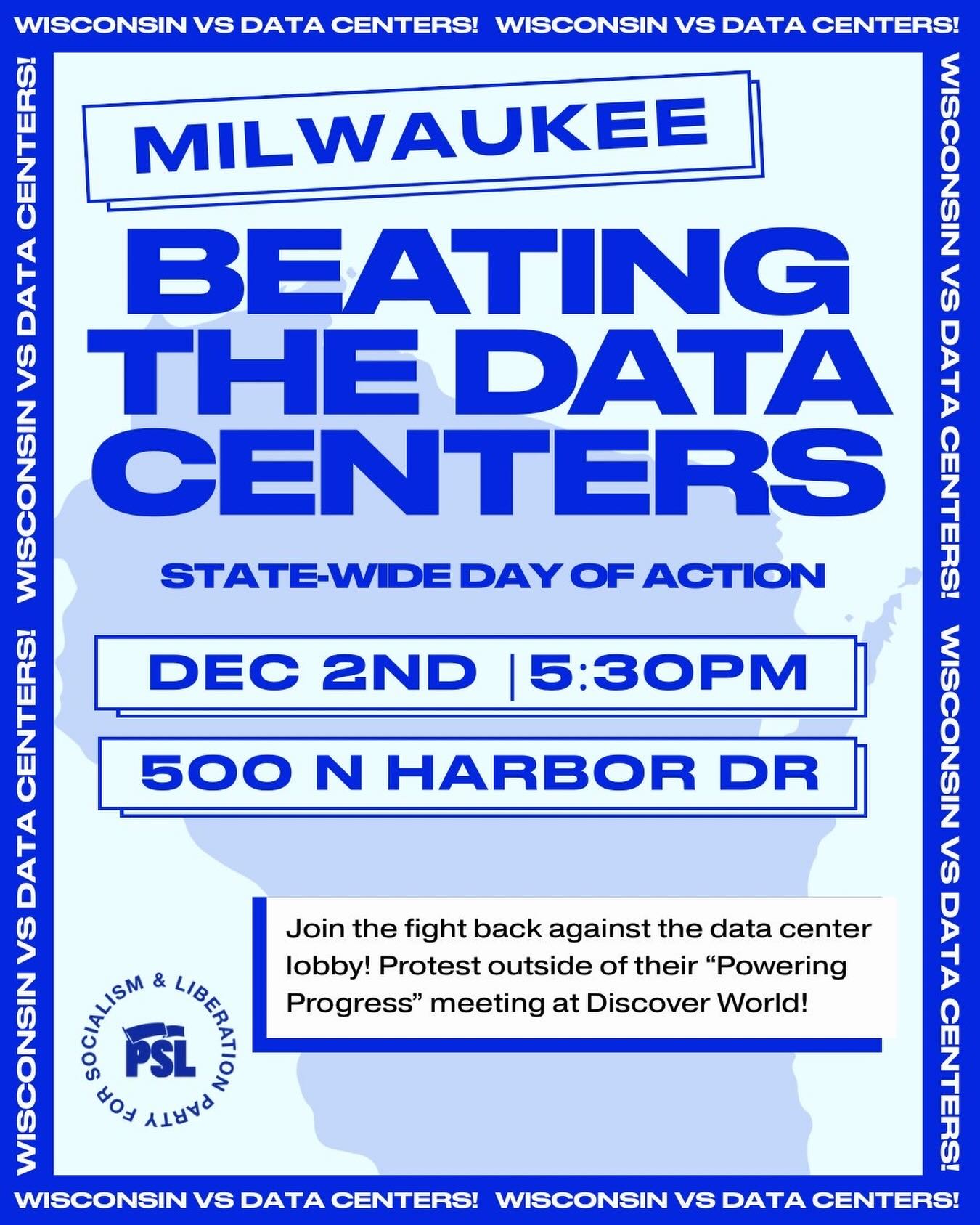 Categories Uncategorized Wisconsin VS. Data Centers: STATEWIDE DAY OF ACTION, Milwaukee December 2, 2025 Post author By WiBOPM Post date November 25, 2025 Share this: Click to share on X (Opens in new window) X Click to share on Facebook (Opens in new window) Facebook Like Loading... Related ← Venezuela Advances Grassroots Democracy with 10,000 New Communal Projects → GI Rights Hotline