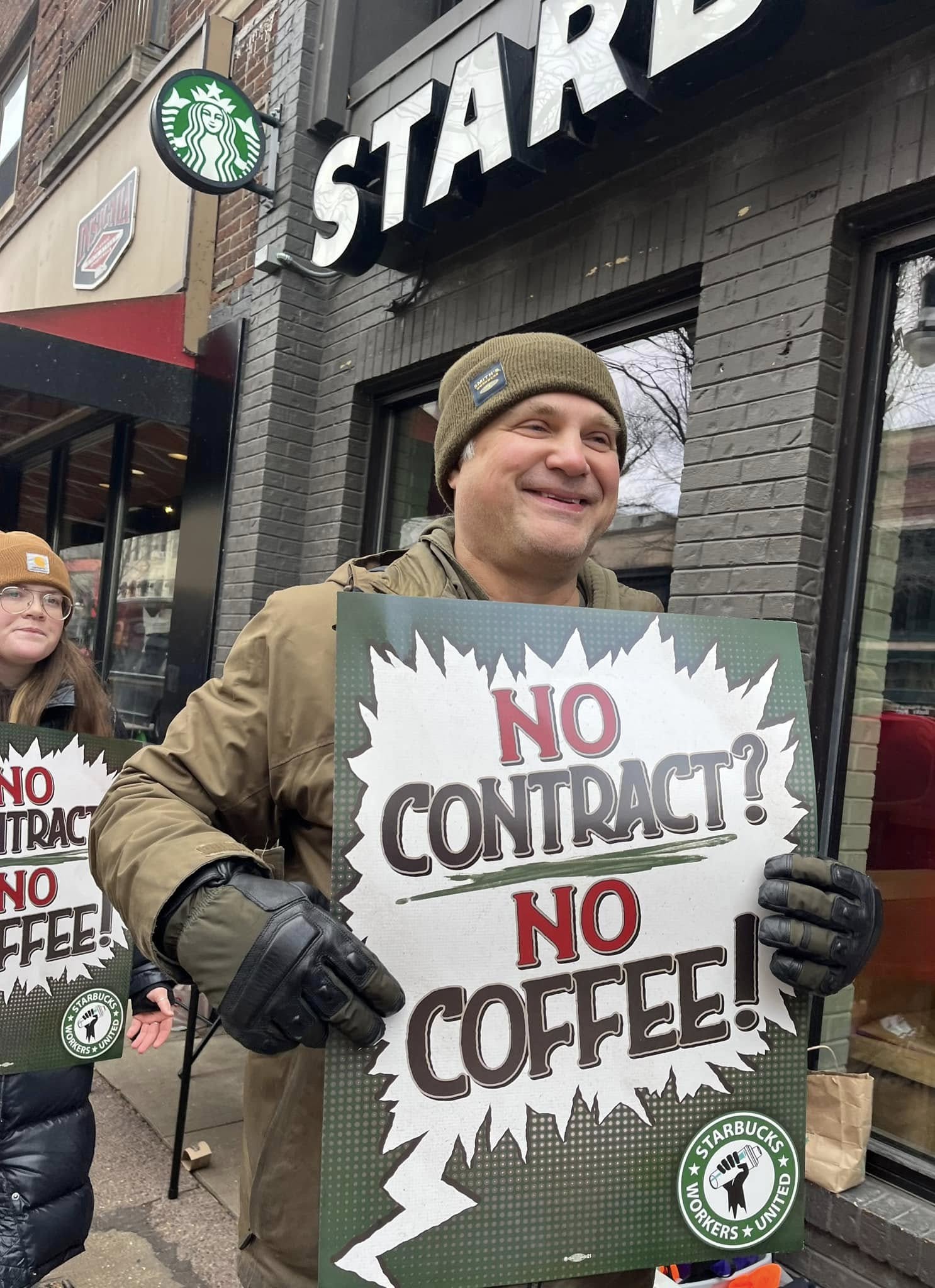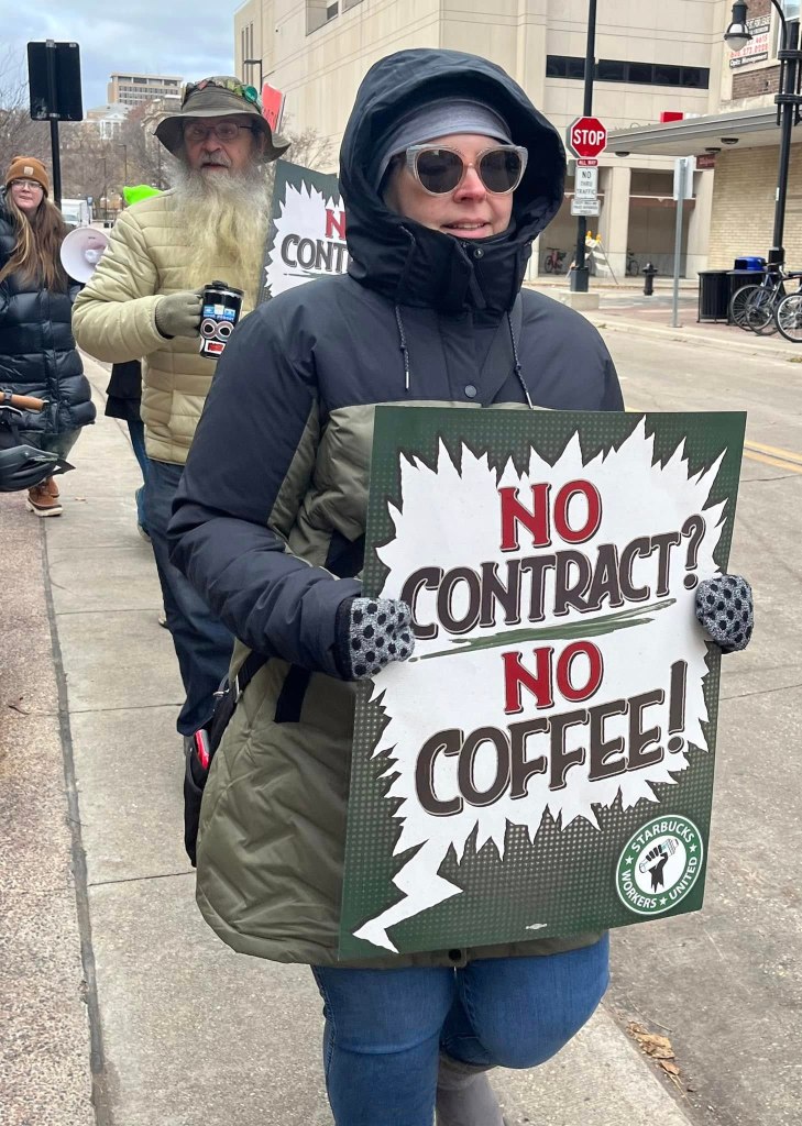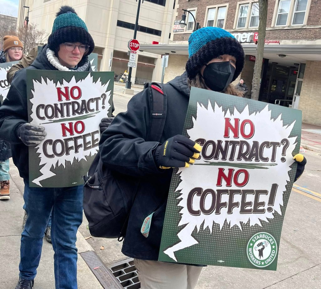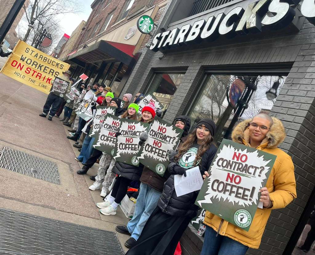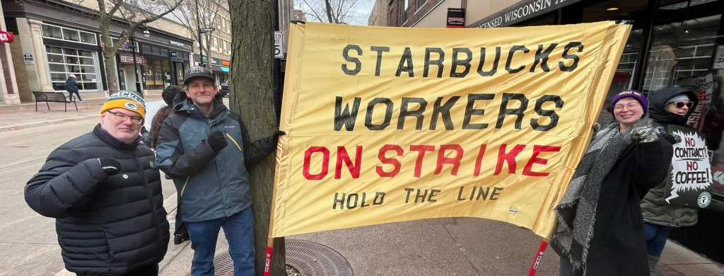 Union members from the Steelworkers, SEIU WI, AFT, UNITE HERE Local 1, AFSCME, SCFL, IBEW and organizations such as the Democratic Socialists of America – Madison and Wisconsin Bail Out The People Movement showed up to support the courageous Starbucks workers striking at 661 State St. in Madison, WI 11/28/25!
