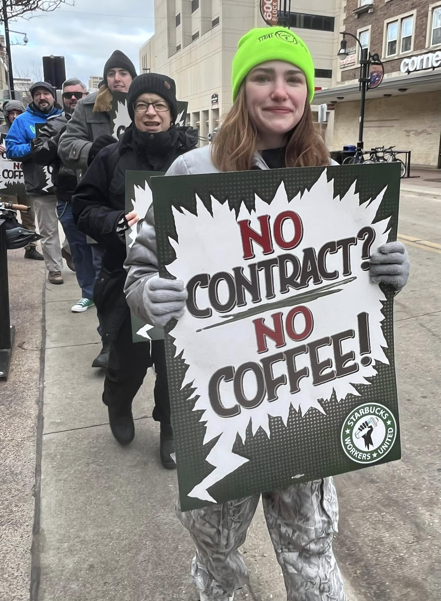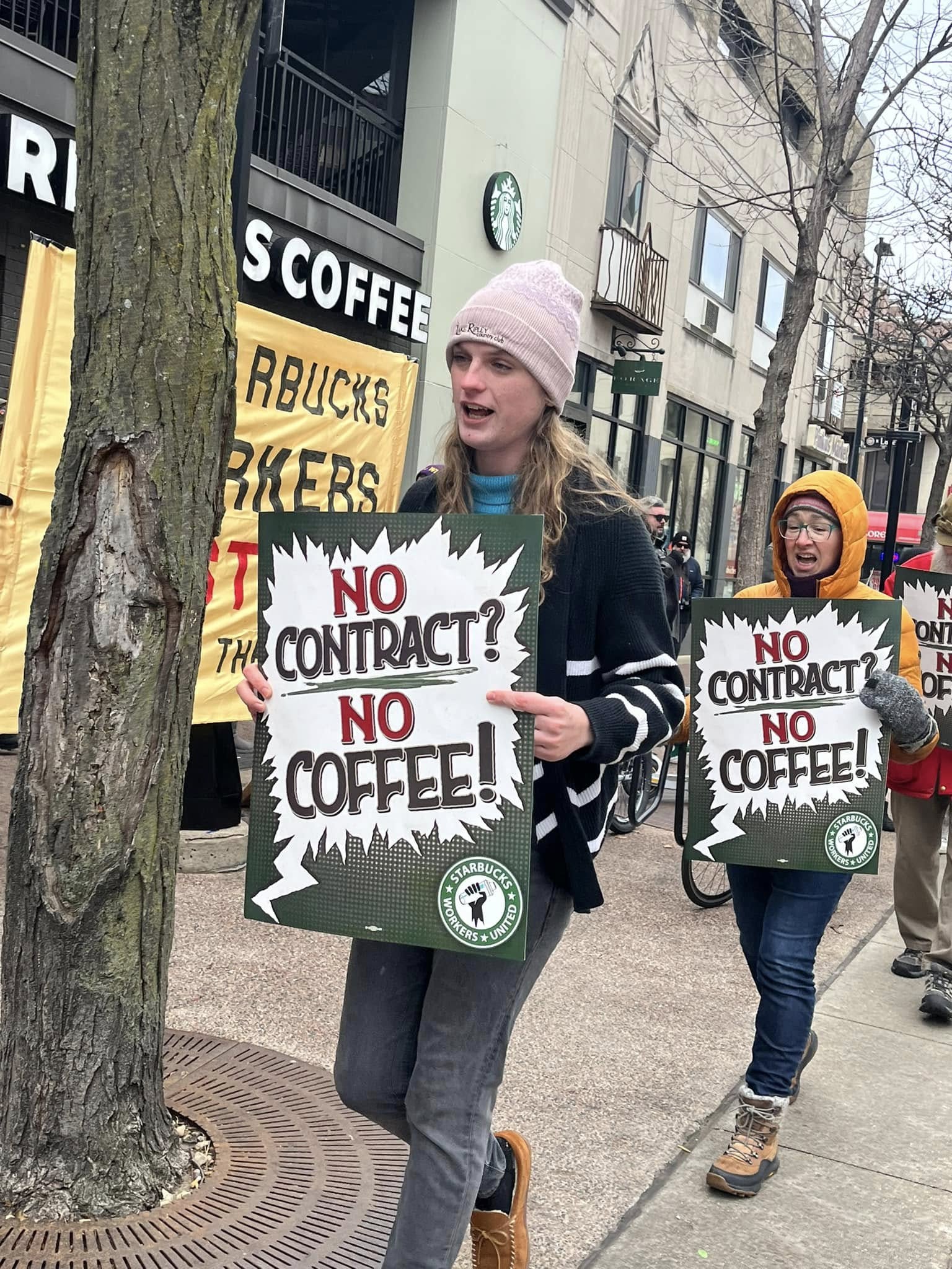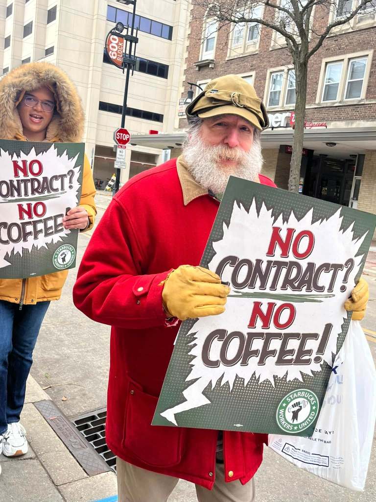 Union members from the Steelworkers, SEIU WI, AFT, UNITE HERE Local 1, AFSCME, SCFL, IBEW and organizations such as the Democratic Socialists of America – Madison and Wisconsin Bail Out The People Movement showed up to support the courageous Starbucks workers striking at 661 State St. in Madison, WI 11/28/25!