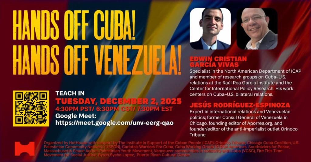 | Hands Off Cuba! Hands Off Venezuela! – an online teach-in with Edwin Christian Garcia Vivas & Jesús Rodríguez-Espinoza. Introduction: Christina Perez Tuesday December 2, 2025 4:30 pacific / 6:30 central / 7:30pm eastern On Google Meet ( https://meet.google.com/unv-eerg-qao) Edwin Cristian García Vivas is a specialist in the North American Department of the Cuban Institute of Friendship with the Peoples (ICAP). He is a member of the Academic Research Group on Relations between Cuba and the United States from the Raúl Roa García Higher Institute of Foreign Affairs and the Center for International Policy Research. He has written and conducted research on the topic of bilateral relations between Cuba and the United States. Jesús Rodríguez-Espinoza is an expert in international relations, Venezuelan politics, and communication. He served for several years as Consul General of Venezuela in Chicago (United States); before that, he was part of the foundational editorial team of Aporrea.org. He is the founder and editor of the Venezuelan anti-imperialist news outlet Orinoco Tribune. Christina Perez is an Associate Professor of Sociology and director of Gender and Women’s Studies and Latinx/Latin American Studies. Her work examines race, gender, coloniality, and social justice in Latin America and U.S. Latinx communities, with teaching and recent scholarship that reframe Latinidad by centering Black and Indigenous experiences and challenging white supremacy. She is also the author of a book on Cuban community-based medicine and a published article on Cuban and Venezuelan medical internationalism Organized by HotHouse with support by The Institute in Support of the Cuban People (ICAP), Orinoco Press, Chicago Cuba Coalition, U.S. Palestinian Community Network (USPCN), Carlota’s Warriors For Cuba, Cuba Working Group IC DSA Americas, Southsiders for Peace, Massachusetts Peace Action, Palestinian Youth Movement, Vancouver communities in solidarity with Cuba (VCSC), Fire This Time Movement for Social Justice, Byron Sycho Lopez, Puerto Rican Cultural Center and The US-Cuba Normalization Committee |