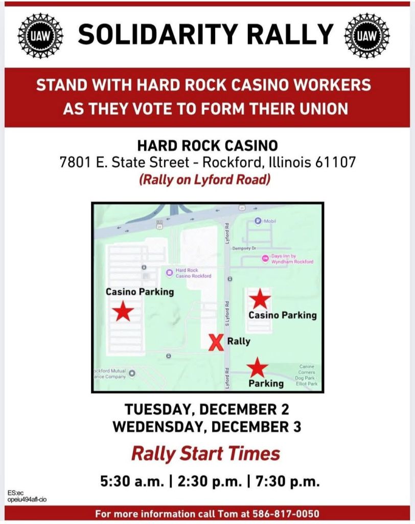 Categories Uncategorized UAW: Stand With Hard Rock Casino Workers in Rockford As They Vote for Their Union December 2 and 3, 2025 Post author By WiBOPM Post date November 30, 2025 Share this: Click to share on X (Opens in new window) X Click to share on Facebook (Opens in new window) Facebook Like Loading... Related ← Most international airlines servicing Venezuela suspend flights as U.S. intensifies pressure → Starbucks Workers On the Move Nationwide; Strikes Growing