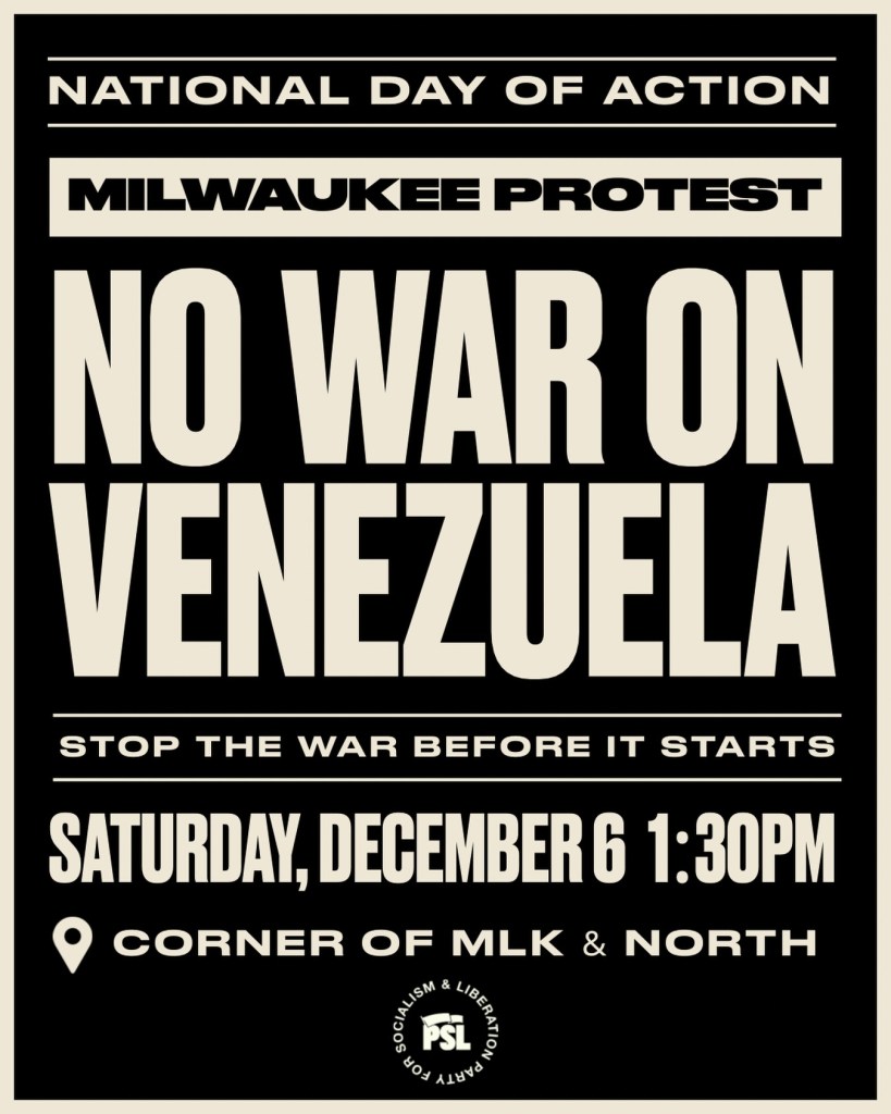 Categories Uncategorized Milwaukee, December 6, 2025: No U.S. War On Venezuela! – Money for People’s Needs Not Endless Wars! – Feed the People Not the Pentagon! Post author By WiBOPM Post date December 2, 2025 MLK and North Avenue, Milwaukee, WI – 1:30 P.M. For news, analysis and background: https://orinocotribune.com/ Madison October 30, 2025. / Photo: Wisconsin Bail Out The People Movement Share this: Click to share on X (Opens in new window) X Click to share on Facebook (Opens in new window) Facebook Like Loading... Related ← Milwaukee4Palestine Volunteer Spotlight for WI BOPM → The Revolution Will Not Be Terrorized