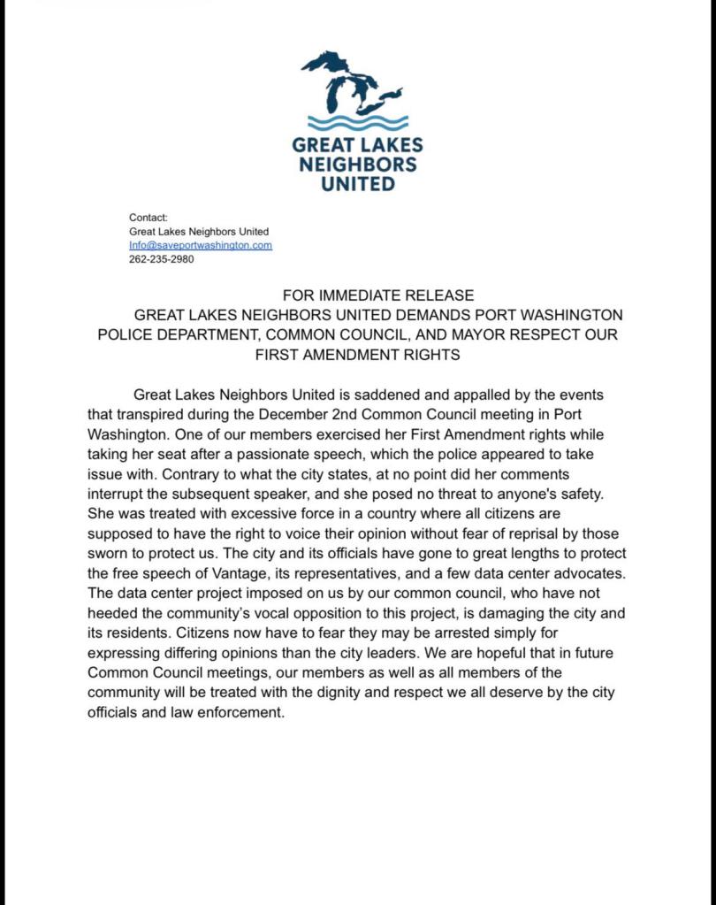 Categories Uncategorized Great Lakes Neighbors United Demands Port Washington Police Department, Common Council, and Mayor Respect Our First Amendment Rights! Post author By WiBOPM Post date December 4, 2025 Screenshot Great Lakes Neighbors United Home Share this: Click to share on X (Opens in new window) X Click to share on Facebook (Opens in new window) Facebook Like Loading... Related ← Detroit, December 6, 2025: No Guard! No ICE! Mass Meeting to Organize to Fight Back Against Authoritarian Attacks! → Grafton and West Bend, WI December 13, 2025: Defend Free Speech! Protest