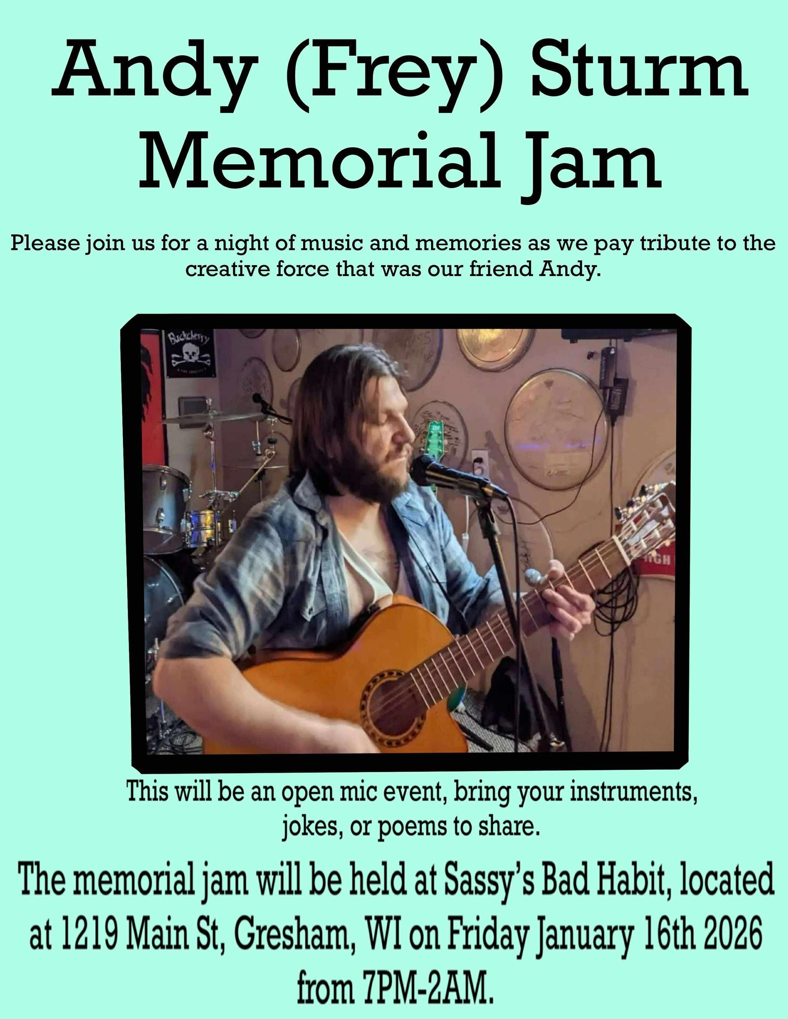 This memorial jam will be held at Sassy’s Bad Habit located at 1219 Main St Gresham, WI on January 16th from 7pm-2am.