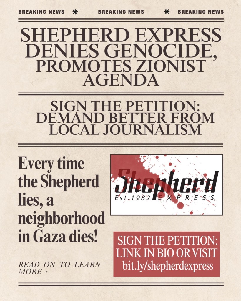 For several months, readers and members of the community have called out Shepherd Express via letters, emails, and comments on social media to demand accurate reporting by factually referring to Israel’s onslaught of Palestinians as what it is: a genocide. This failure to hold Israel accountable for its war crimes against Palestinians, the civilians of several surrounding countries, and activists attempting to deliver humanitarian aid to Gaza, is part of a pattern of substandard journalistic practice when it comes to Palestine – a pattern shamefully exhibited in the Shepherd Express and in media broadly. In choosing to distort the reality of the severity and intentionality behind Israel’s genocide of Palestinians, the Shepherd Express is giving cover to the worst possible crime against humanity and instead prioritizing the hateful rhetoric and violent outcomes of a Zionist agenda.