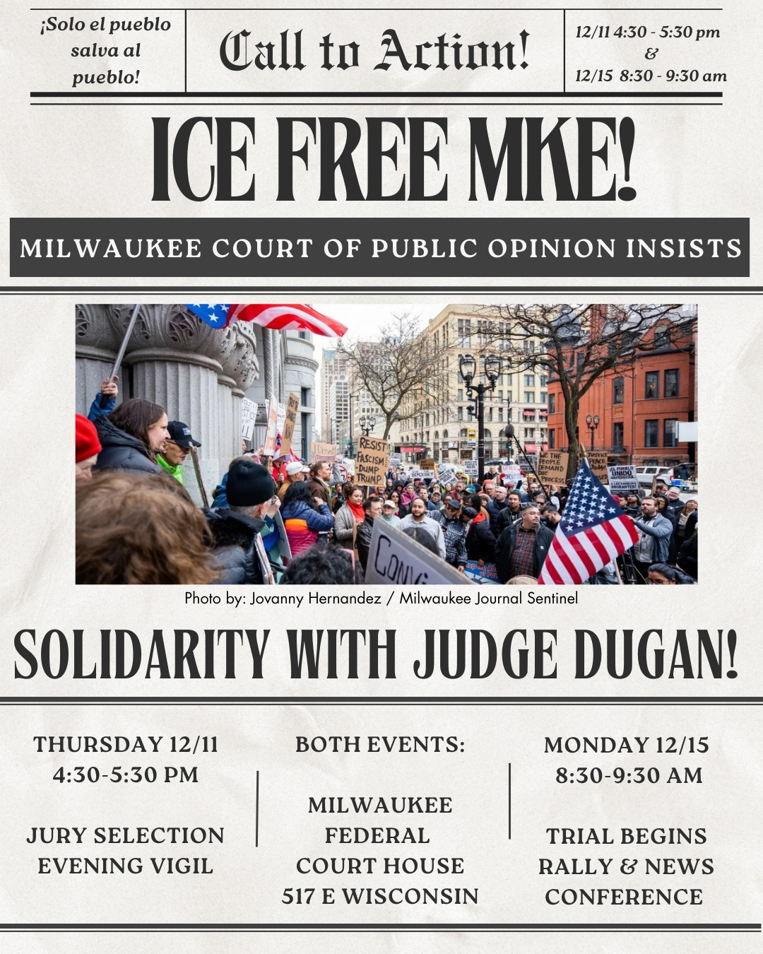 Join Milwaukee coalition members representing labor, immigrant rights, and faith organizations for a rally and press event the morning of Judge Hannah Dugan’s trial date, currently set for Monday, December 15th at 9:00 a.m.