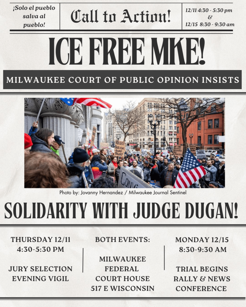 Join Milwaukee coalition members representing labor, immigrant rights, and faith organizations for a rally and press event the morning of Judge Hannah Dugan’s trial date, currently set for Monday, December 15 at 9 a.m.