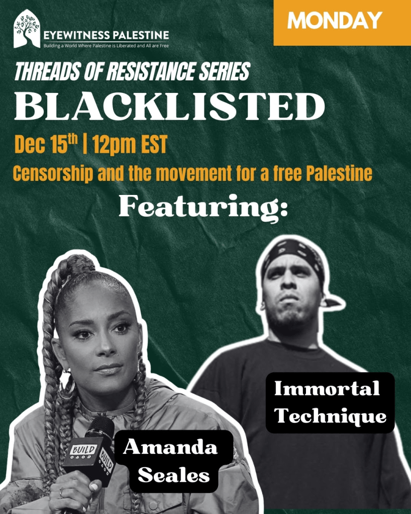 Don’t miss this powerful week-long series uplifting voices across the global movement for Palestinian liberation, featuring artists, organizers, public figures, spiritual leaders, and past Eyewitness Palestine delegates who have witnessed the occupation on the ground firsthand. Each session offers unique perspectives, bringing together stories, experiences, and acts of resistance that span communities and continents.