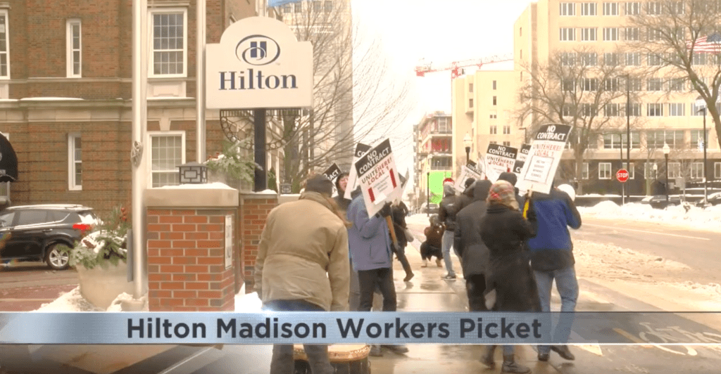 | On December 10, the union workers at the Hilton Monona Terrace released a report outlining their shocking working conditions after picketing the hotel. In the midst of bargaining their first contract, these workers are only demanding a dignified workplace. Timothy Farland, a dishwasher, said: “I work full time as a dishwasher and I’m homeless… I’m trying to save enough to get my own place but it’s been hard. I feel so angry, because I am doing the best that I can and still falling behind.” Omar, a room attendant, said: “My two young sons and my wife still live in Senegal. I have a dream of bringing them to America, but it’s hard to save any money.” And Gina, a room attendant as well, said: “I know that women my age need regular mammogram screenings, but I haven’t gotten an appointment because I’m so scared of the bill that will come.” These are just some of the stories that workers told in the report and on the picket line. At this crucial moment in time, it is essential that we support these workers in their struggle, and tell the Hilton and all employers that working conditions like these are completely unacceptable in Wisconsin. From the beginning, Worker Justice Wisconsin staff and members have stood behind the Hilton employees, and will continue to support any hotel workers who want to organize as well. As Executive Director Robert Christl said during the press conference: “At WJW, we have met dozens of hotel employees who’ve come to us experiencing these exact same problems. Now, we can tell them there is a living, breathing alternative to just getting by and hoping that the boss will do the right thing. We can tell them about Local 1.” If you are a hotel worker interested in organizing, reach out to Robert at robert@workerjustice.org. If you are a member of the community and want to support these workers, please join our Rapid Response Network and donate here. To read the full report about the working conditions at the Hilton Monona Terrace, click here. For coverage of the picket and the issues they are facing, click here. |