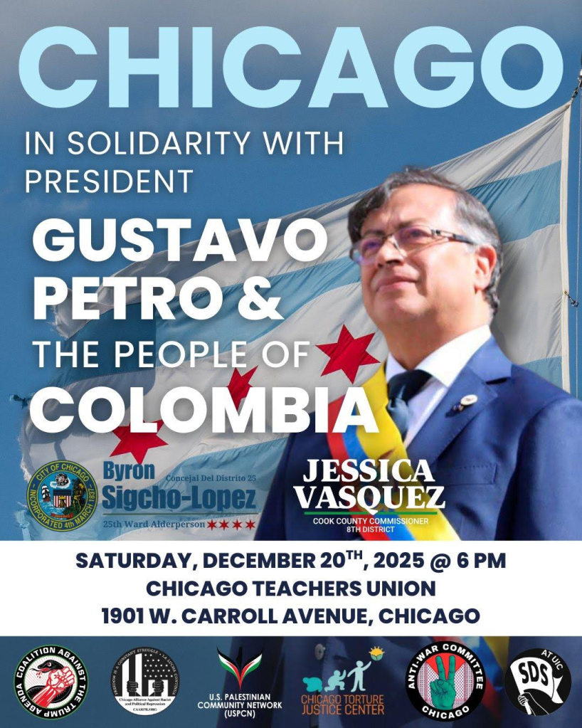 Categories Uncategorized Chicago: In Solidarity with President Gustavo Petro & the People of Colombia December 20, 2025 Post author By WiBOPM Post date December 16, 2025 Share this: Click to share on X (Opens in new window) X Click to share on Facebook (Opens in new window) Facebook Like Loading... Related ← Arrested for asking Starbucks to do the bare minimum