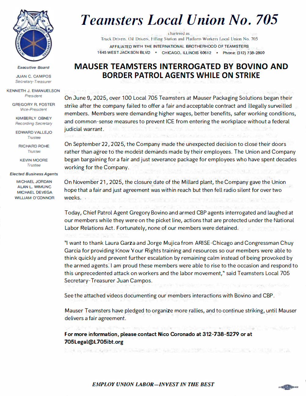 Categories Uncategorized Chicago: ICE / Bovino Attempt to Menace Striking Workers, Teamsters Local 705 Fights Back Post author By WiBOPM Post date December 18, 2025 https://www.teamsterslocal705.net/mauser-teamsters-interrogated-on-strike Share this: Click to share on X (Opens in new window) X Click to share on Facebook (Opens in new window) Facebook Like Loading... Related ← Italy, 1947-1948: Free elections, Hollywood-style by William Blum → Madison, December 19, 2025: Wisconsin Alliance for Retired Americans Holiday Party
