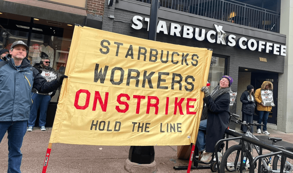 Categories Uncategorized Madison, December 19, 2025: Starbucks Workers United STRIKE! Post author By WiBOPM Post date December 18, 2025 Picket at the Cap Square Location, 1 E Main Street, Madison, WI 11 A.M. – 3 P.M. SBWorkersUnited Members and Leaders of the Steelworkers, IBEW, SEIU Wisconsin, @wibopm, the DSA Madison and more support striking Starbucks Workers November 28, 2025 at the State Street Location in Madison. / Photo: Wisconsin Bail Out The People Movement Share this: Click to share on X (Opens in new window) X Click to share on Facebook (Opens in new window) Facebook Like Loading... Related ← Solidarity with the Bad River Band of Lake Superior Chippewa! – Water IS Life! → Madison, January 10, 2026: Know Your Rights, Trans Edition