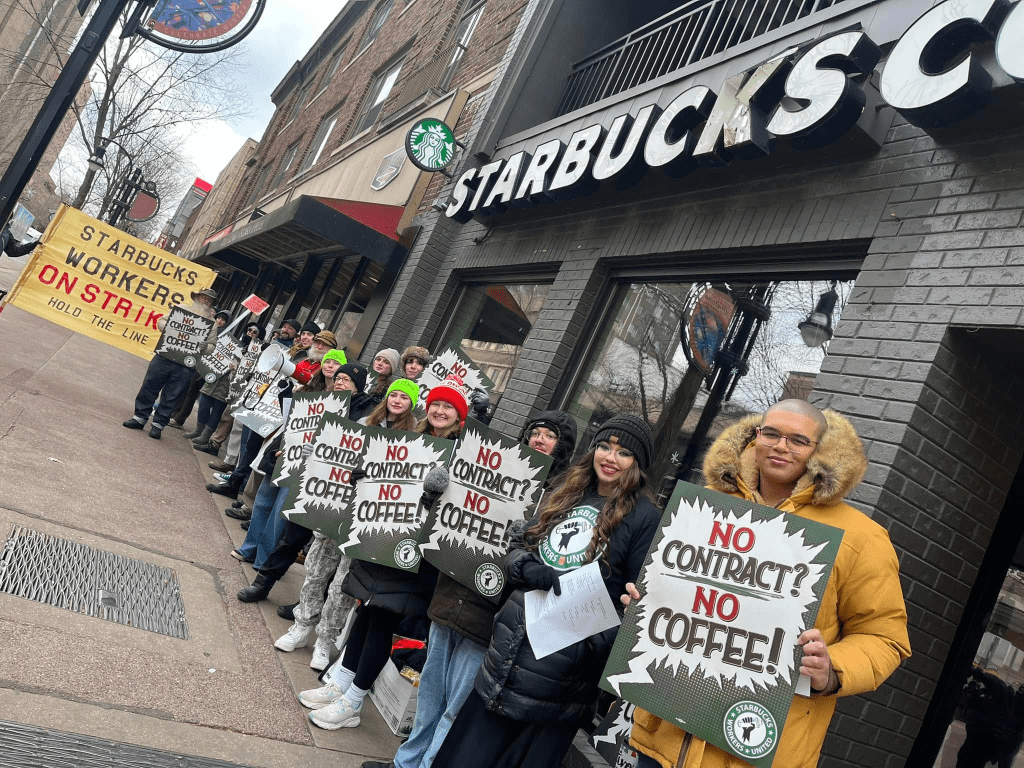 Starbucks workers and supporters from the Steelworkers, IBEW, SEIU Wisconsin, @wibopm and DSA Madison, hold the strike picket line together in solidarity November 28, 2025 at the State Street location in Madison. Photo: Wisconsin Bail Out The People Movement