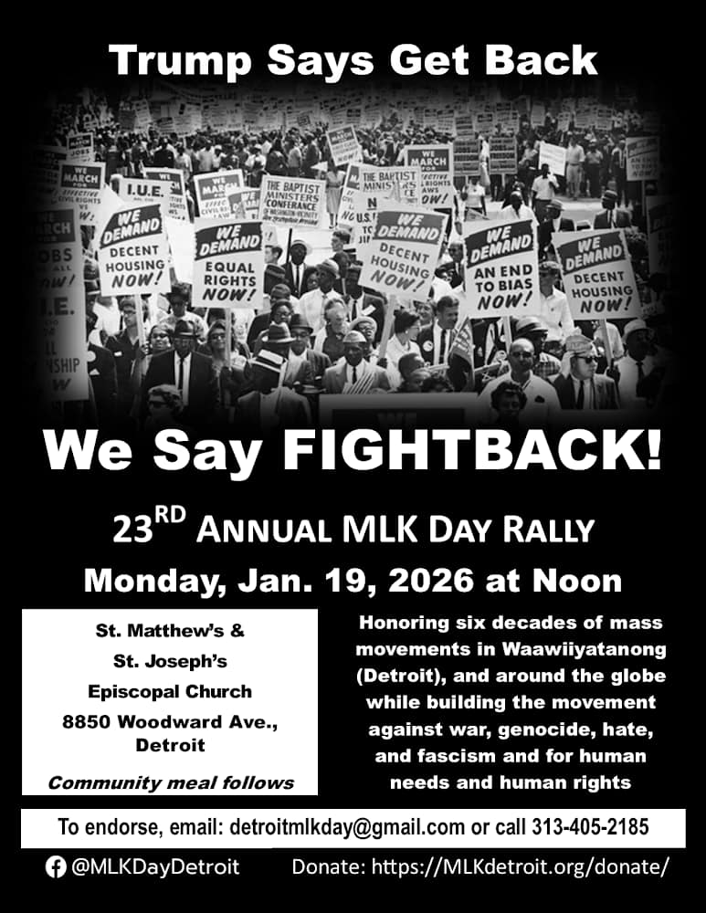 Categories Uncategorized Detroit, January 19, 2026: Trump Says Get Back, We Say Fight Back! – 23rd Annual MLK Day Rally Post author By WiBOPM Post date December 20, 2025 Moratorium NOW! Coalition Share this: Click to share on X (Opens in new window) X Click to share on Facebook (Opens in new window) Facebook Like Loading... Related ← Support Judge Hannah Dugan! – ICE Out of Milwaukee & Everywhere! → Oak Creek, WI, January 19, 2026: Media Narratives & Liberation – Palestine in the Spirit of MLK with Abby Martin