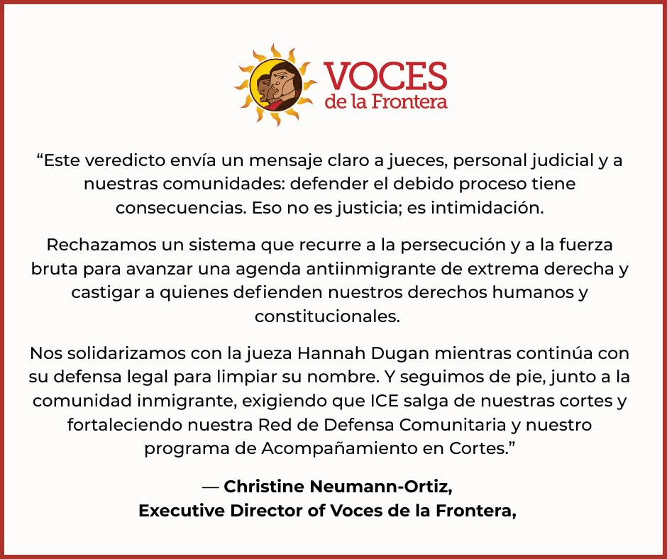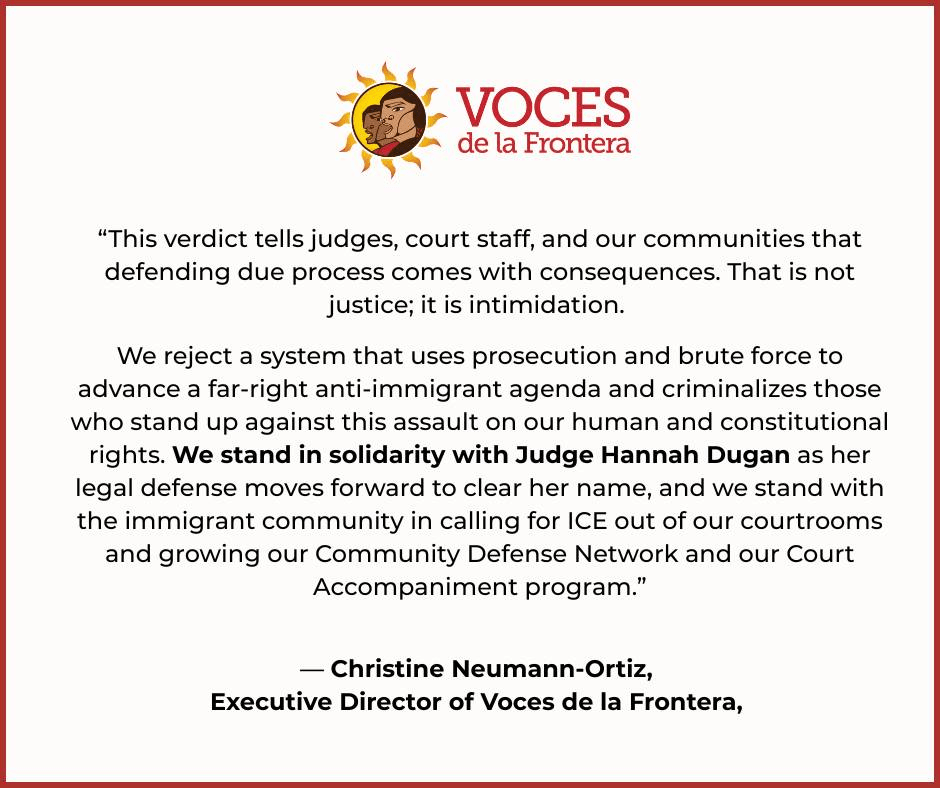 Categories Uncategorized Voces de la Frontera Statement: We Stand in Solidarity with Judge Hannah Dugan! – Stop ICE! Post author By WiBOPM Post date December 20, 2025 Voces de la Frontera Share this: Click to share on X (Opens in new window) X Click to share on Facebook (Opens in new window) Facebook Like Loading... Related ← Thousands of Baristas in 150 Plus Cities in the U.S. on STRIKE! → Milwaukee, January 19, 2026: 25 Years of the MLK Justice Program – Unite Against Militarism, Racism and Poverty